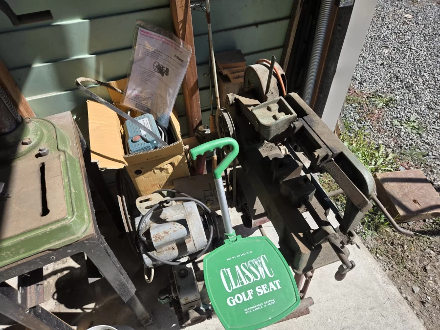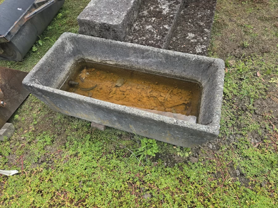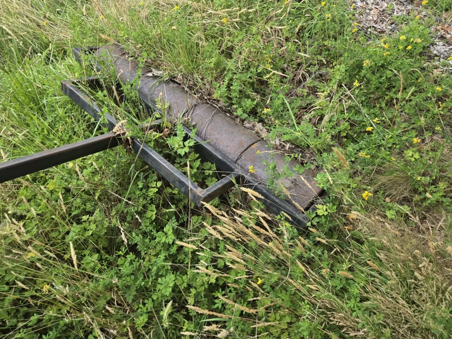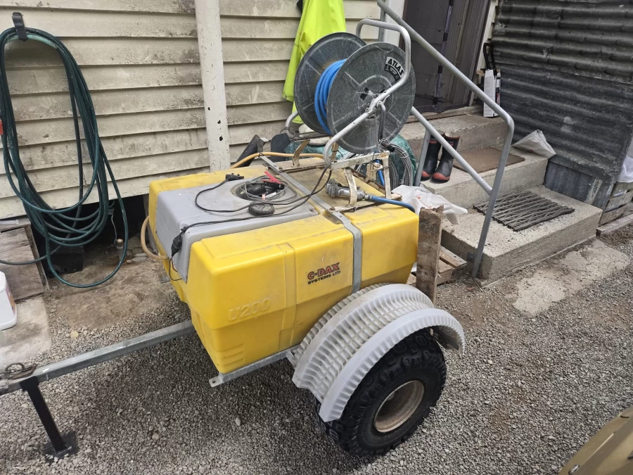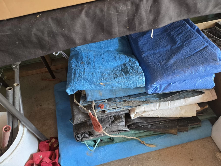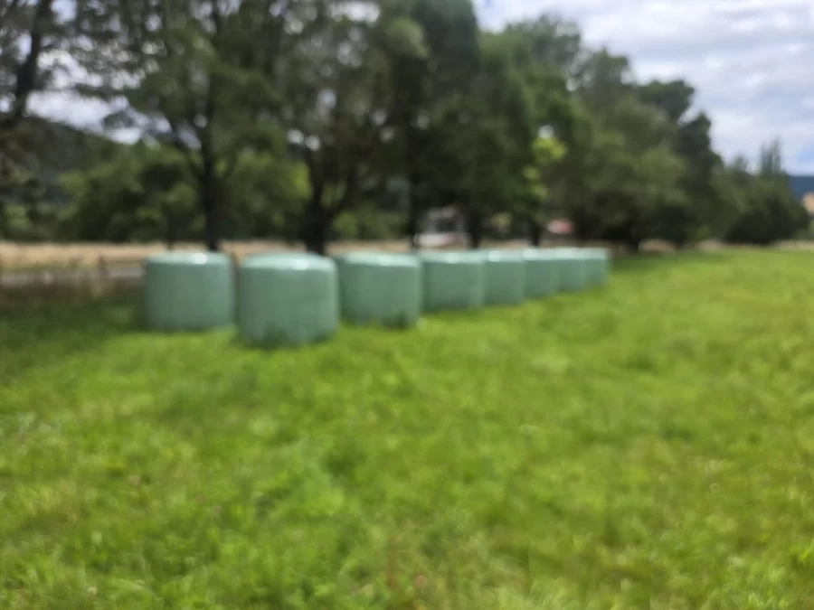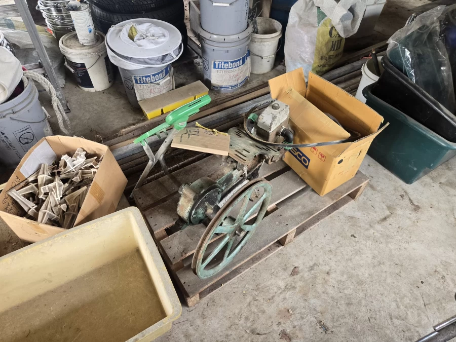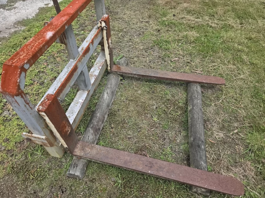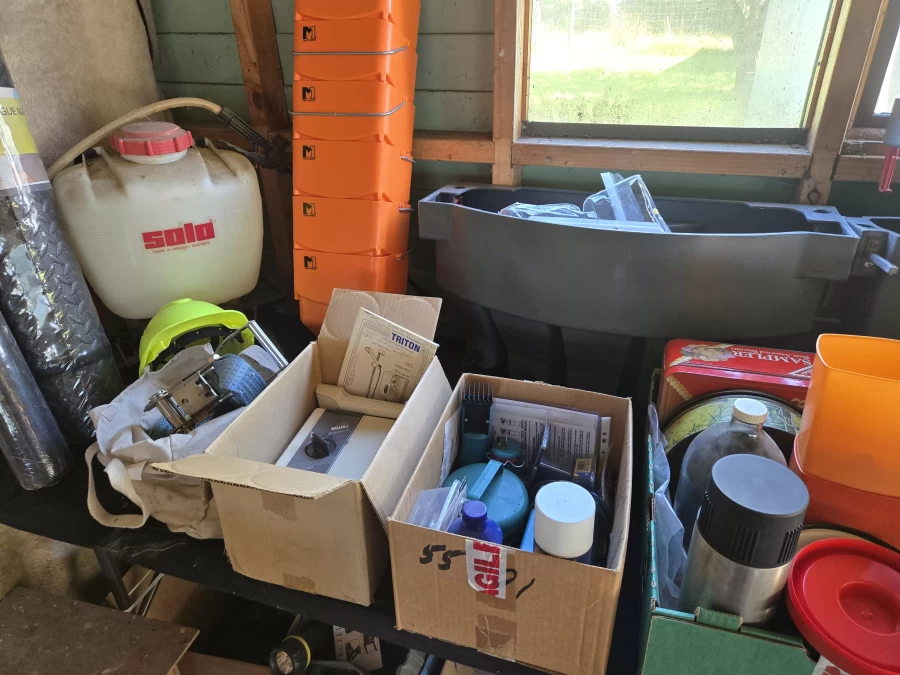 40 big round bales, spray unit, calf feeders, tools, trailer,